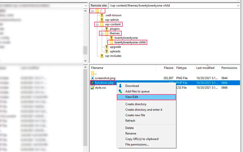 Затем перейдите в каталог /wp-content/themes и найдите папку вашей дочерней темы. Щелкните, чтобы открыть ее, и найдите в ней файл functions.php. Щелкните файл правой кнопкой мыши и выберите в меню пункт View/Edit (Просмотр/редактирование).