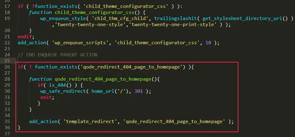 Код представляет собой пользовательскую функцию qode_redirect_404_page_to_homepage(). Она перенаправляет URL пользователя на главную страницу сайта с помощью функции wp_safe_redirect(). URL домашней страницы задается с помощью функции home_url(). Поскольку результатом этой функции является URL домашней страницы без косой черты, мы должны указать его в качестве параметра.