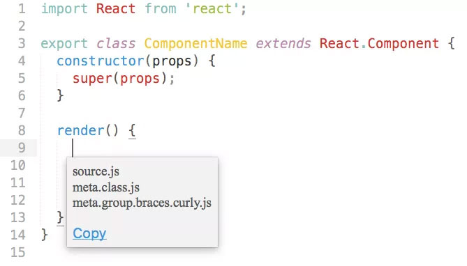 Мы говорили об ограничении сниппетов определенными файлами исходного кода, но часто сниппеты имеют более детальный контекст, в котором они действительны. В качестве примера, такой метод, как componentWillUpdate, обычно имеет смысл только в рамках определения компонента (класса), которое явно выражено.