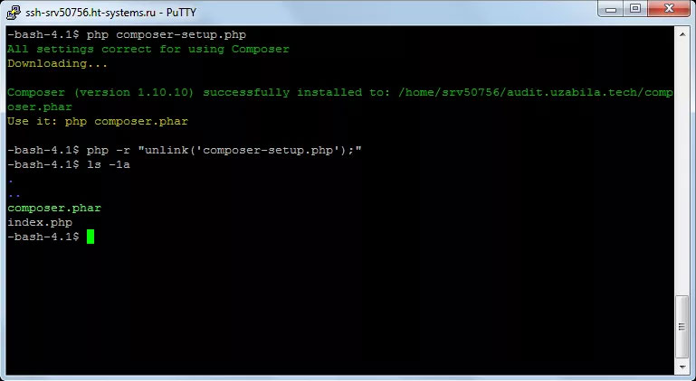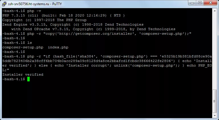$ php -r "if (hash_file('sha384', 'composer-setup.php') === 'e5325b19b381bfd88ce90a5ddb7823406b2a38cff6bb704b0acc289a09c8128d4a8ce2bbafcd1fcbdc38666422fe2806') { echo 'Installer verified'; } else { echo 'Installer corrupt'; unlink('composer-setup.php'); } echo PHP_EOL;"