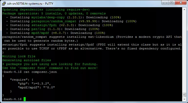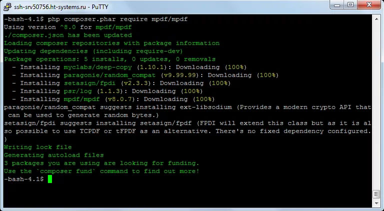 На данном этапе мы установили в локальную папку на сервере менеджер зависимостей и теперь нам нужно установить нужную библиотеку для работы с PDF — mPDF.