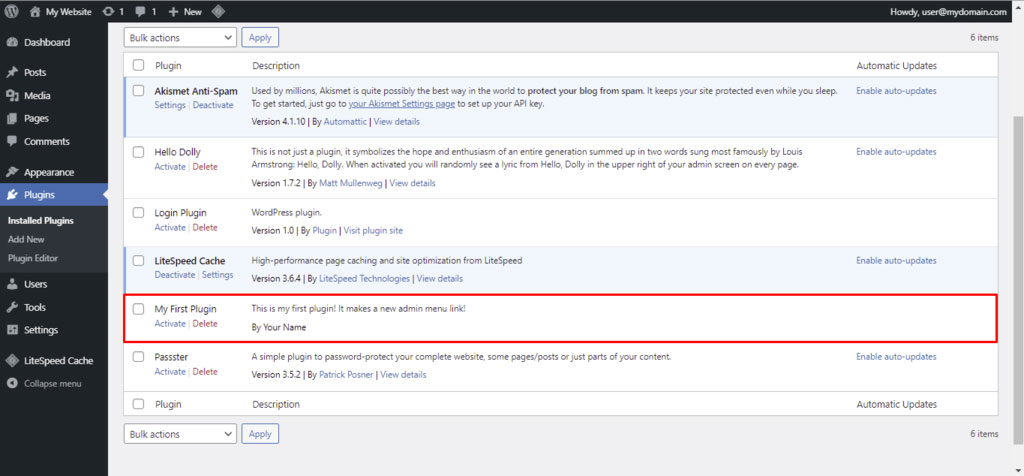 После сохранения файла вы сможете увидеть свой плагин в списке плагинов на вашем сайте WordPress. Войдите в админку своего сайта WordPress и нажмите «Плагины» (Plugins) на левой панели навигации администратора WordPress. На этой странице отображается список всех плагинов, которые есть на вашем сайте. Ваш новый плагин теперь должен быть в этом списке!