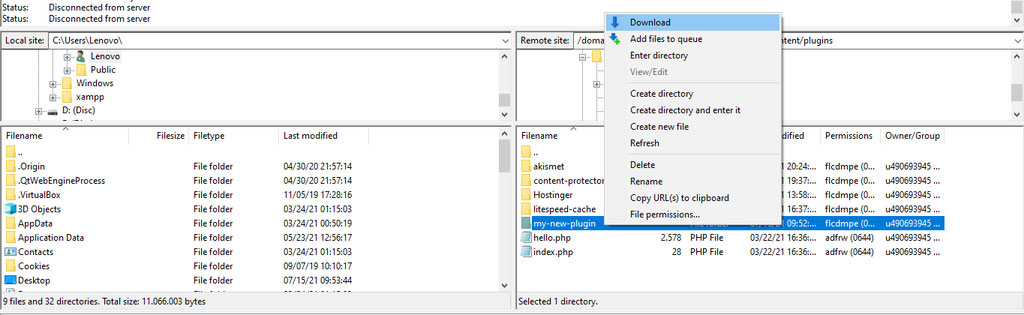1. В FileZilla щелкните правой кнопкой мыши на папке my-new-plugin и выберите Download. Затем сожмите файлы в ZIP-архив.