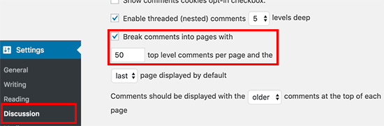 WordPress поставляется со встроенным решением для этого. Просто перейдите в Настройки -> Обсуждения (Settings -> Discussion ) и установите флажок напротив опции «Разбивать комментарии на страницы» (Break comments into pages).