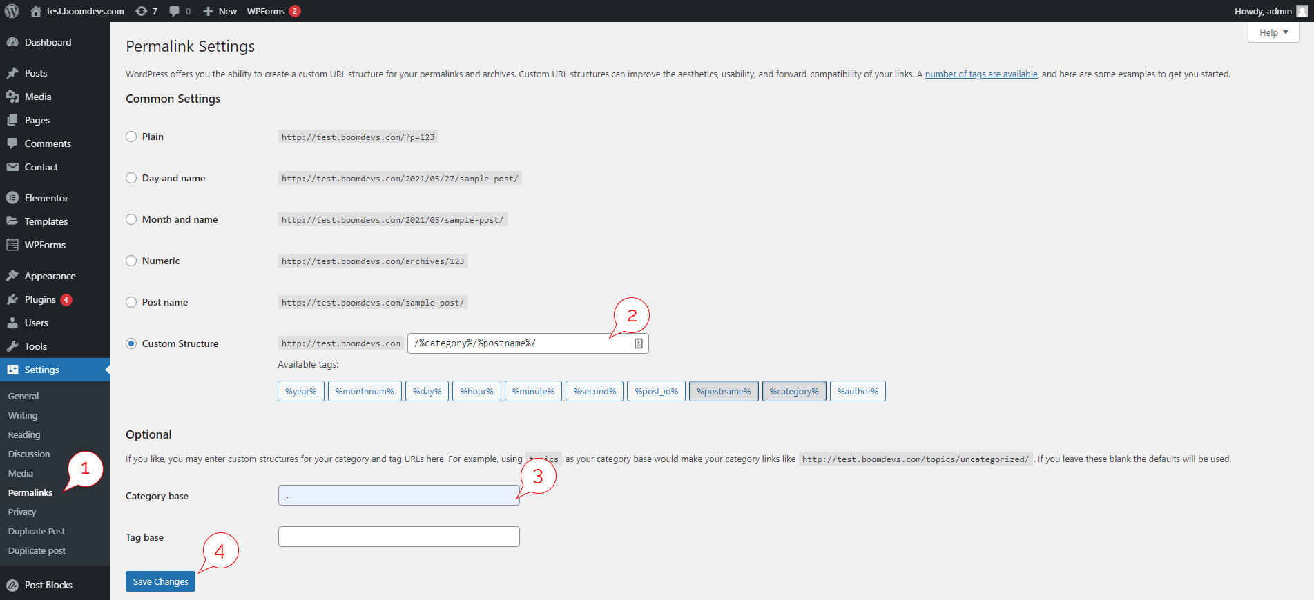 Процедура не будет работать полноценно, пока вы не поставите точку (.). Перейдите на страницы разных категорий на вашем сайте после сохранения настроек, чтобы увидеть изменения. Вы увидите, что ваш URL не содержит теперь слово category. Не забудьте сбросить кэш, если это необходимо.