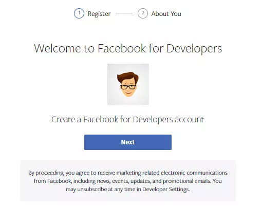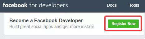 Переходим на сайт Facebook Developers и нажимаем на зеленую кнопку «Register now» (рус. — Зарегистрироваться сейчас), чтобы зарегистрироваться в качестве Разработчика для создания нового приложения.