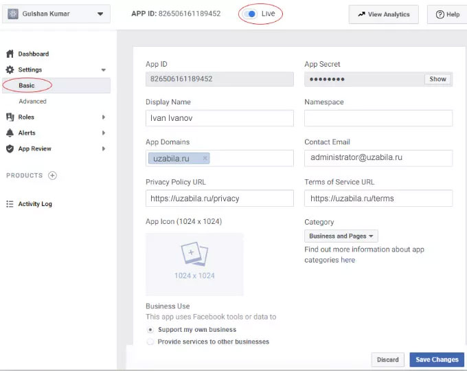 Перейдите в раздел «Основные настройки» (Basic Settings). Далее заполните основные данные. После этого вы сможете активировать ваше приложение (live).