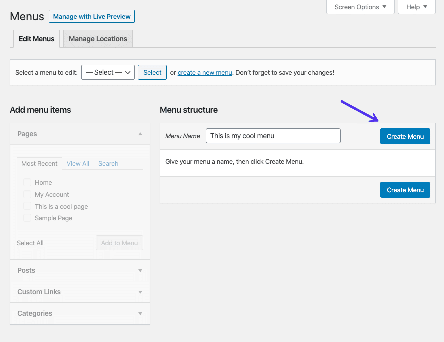 В данном примере мы выберем последний вариант и создадим новое меню. Для этого нужно добавить заголовок, а затем нажать кнопку «Создать меню» (Create Menu):