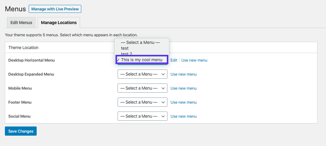 Вы также можете перейти на вкладку «Управление областями» (Manage Locations) в блоке «Меню» (Menus) на панели инструментов. Здесь вы можете увидеть все места расположения меню, поддерживаемые вашей темой, а также то, какое меню вы назначили для каждого из них: